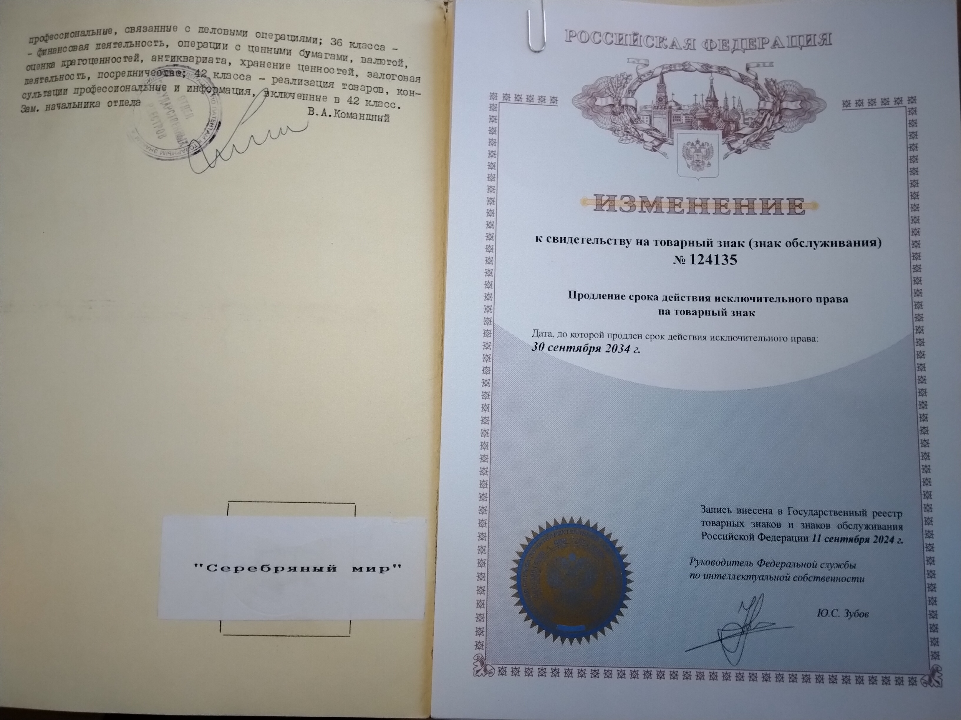 Ïðîäàþòñÿ çàðåãèñòðèðîâàííûå â óñòàíîâëåííîì ïîðÿäêå òîâàðíûå çíàêè ÑÅÐÅÁÐßÍÛÉ ÌÈÐ (ñâèäåòåëüñòâî Ðîñïàòåíòà ¹124135) è SILVER WORLD(ñâèäåòåëüñòâî Ðîñïàòåíòà ¹124136) ïî êëàññàì 14, 35, 36, 42. Öåíà êàæäîãî òîâàðíîãî çíàêà 250 000 ðóáëåé.